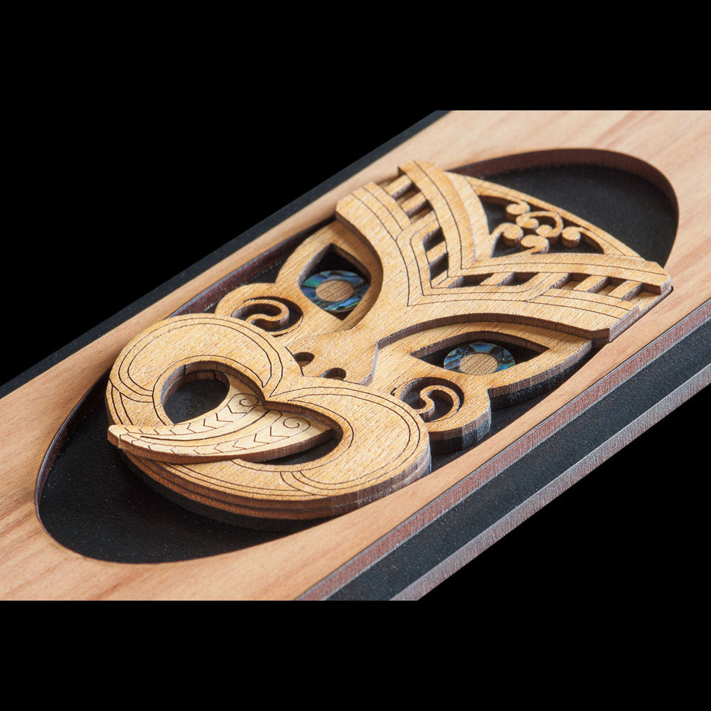A layered wooden full 3D form Wheku hanging wall panel with paua shell inlays and extraordinary detail.